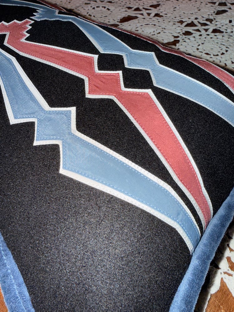 Osage ribbonwork cut and fold taffeta on broadcloth, back broadcloth, velvet trim.